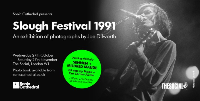 JUST ANNOUNCED….on Oct 27th-Nov 27th there will be an exhibition of Joe Dilworth’s photos from Slough Festival 1991 upstairs at The Social. The opening night is Oct 27th, when I will be spinning some tunes along with performances from Mildred Maude and Sennen (and Pye Corner Audio is also Djing!) xx